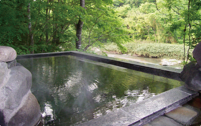 「贅沢な源泉掛け流しの湯船からは、開放感溢れる川沿いの景色が広がります。」