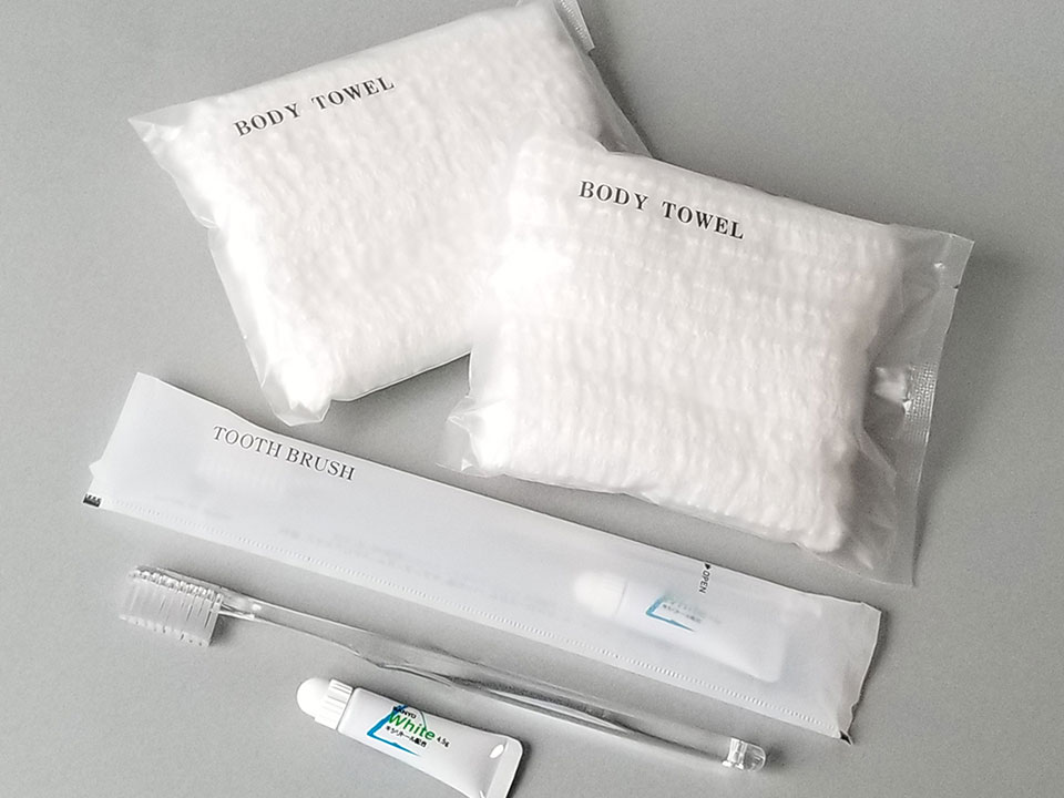 ハブラシとボディタオルボディタオルは伸縮性に優れ使いやすい素材です。(フロント・ロビーでの提供に変更させていただきます)