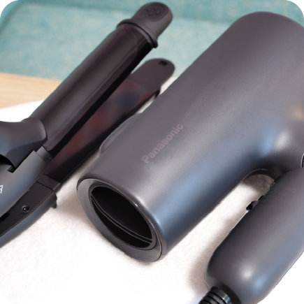 速乾・大風量で髪をいたわりながら乾燥できるマイナスイオンヘアドライヤーとヘアアイロンを全室に完備しております。