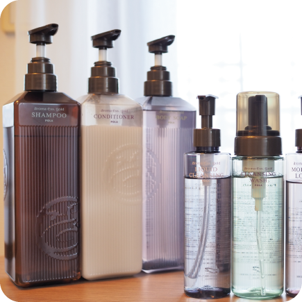 POLAアロマエッセゴールドシリーズのボディシャンプー、シャンプー、リンス。そして基礎化粧品もボトルタイプにいたしました。女子グループで泊まっても使う量を気にせずしっかりお肌をケアできます。
